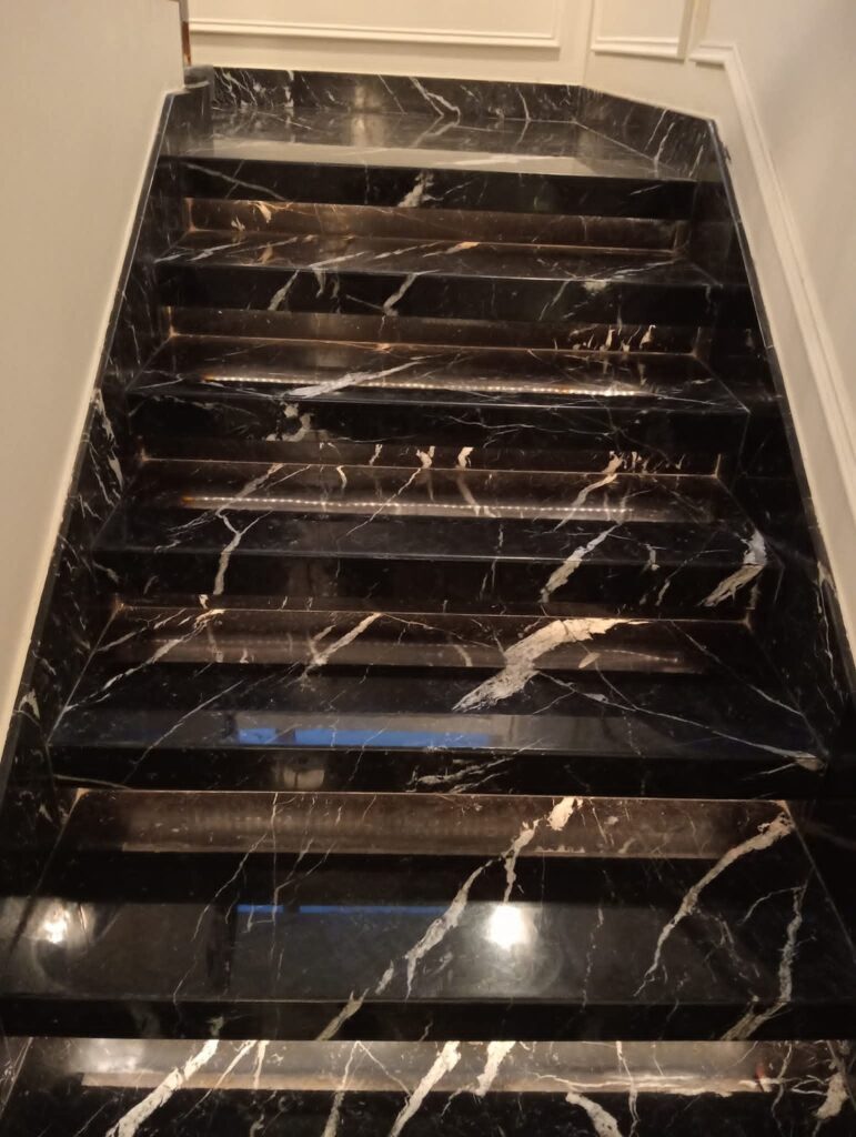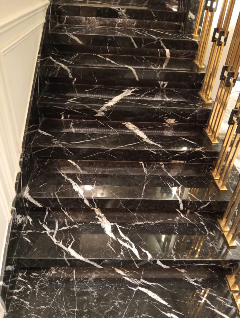 تكمن صعوبة الدرج في ضيق المساحة والزوايا القائمة (القائمة والنائمة)، ولكن بفضل خبرتنا في جدة، نستخدم أقراص ألماس صغيرة الحجم ومرنة تتشكل مع انحناءات الرخام، مما يزيل البقع السوداء التي تتراكم عادة في أطراف الدرج وتفسد مظهره.