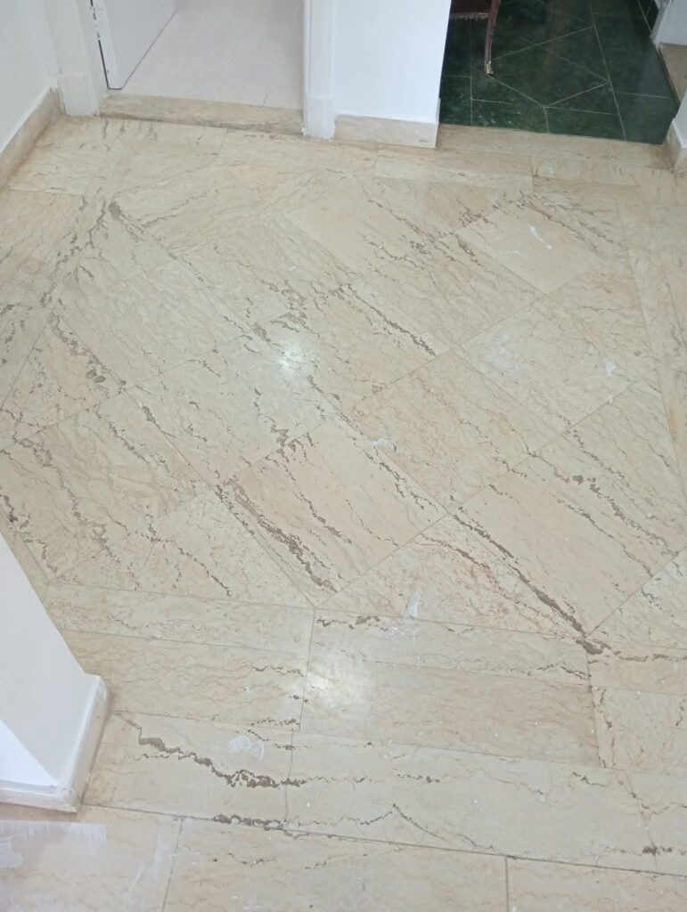 نعم، الجلي يزيل هذا السواد تماماً لأنه ناتج عن تراكم الأوساخ القديمة داخل مسام الرخام.