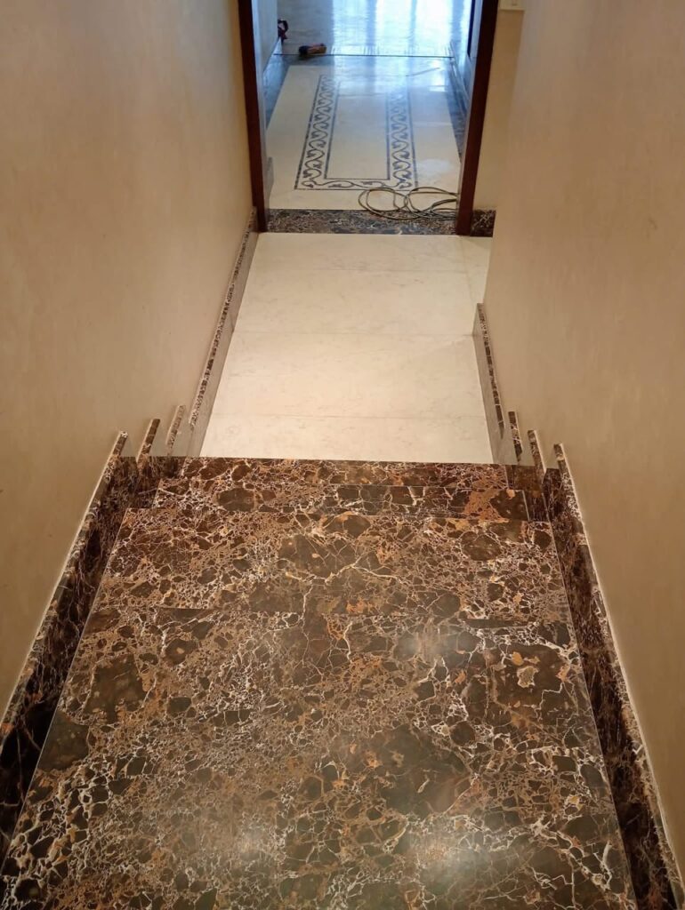 الجلي لا يعيد اللمعان فقط، بل يزيل التعرجات التي قد تسبب التعثر، كما أنه ينظف الفواصل التي تجمع البكتيريا، مما يجعل درج منزلك بجدة مكاناً آمناً ونظيفاً ويزيد من عمر الرخام الافتراضي ضد التكسر.